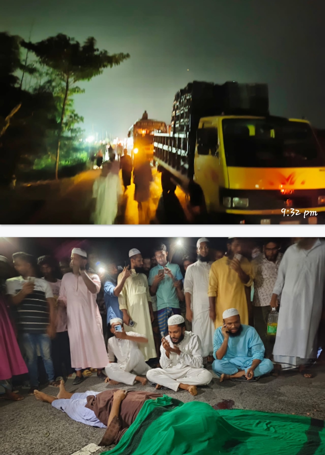 আমতলীতে রেজাউল করিমের নিহতের পর সড়ক অবরোধ, বাস চালক ও হেলপার আটক করার দাবী।