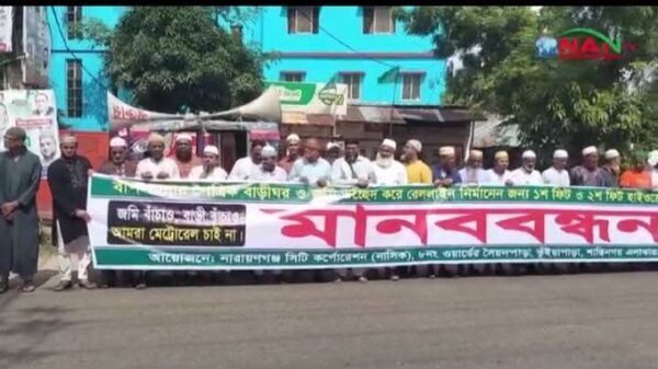 সিদ্ধিরগঞ্জে রেললাইন নির্মাণের প্রতিবাদে মানববন্ধন।