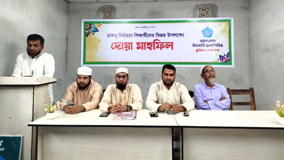 ঢাকা বিশ্ববিদ্যালয় কেন্দ্রীয় ছাত্র সংসদ নির্বাচন-২০২৫ এ বাংলাদেশ ইসলামী ছাত্রশিবির সমর্থিত প্যানেল বিজয়ের পর কুড়িগ্রামে দোয়া মাহফিল ও আলোচনা সভা অনুষ্ঠিত হয়েছে। প্রধান অতিথি আতাউর রহমান শিক্ষার্থীদের নৈতিকতা ও ইসলামী শিক্ষার গুরুত্ব সম্পর্কে বক্তব্য রাখেন।
